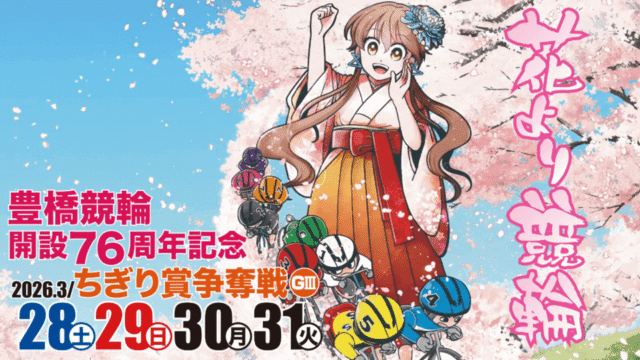 豊橋競輪GⅢ「開設76周年記念ちぎり賞争奪戦2026」の展望記事。出場選手一覧、シリーズ展望、豊橋バンクの特徴や攻略ポイント、場内イベント情報、アクセス方法までまとめて解説。眞杉匠・阿部拓真らトップレーサーが集結する注目シリーズを徹底ガイド。