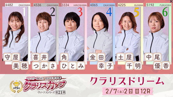 「ヴィーナスシリーズ第21戦 マンスリーBOAT RACE杯争奪 第15回クラリスカップ」は、2月6日(金)から11日(水)までの6日間開催で行われる。