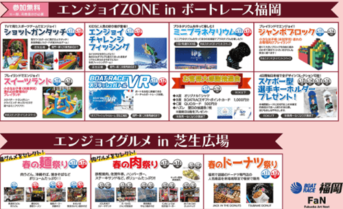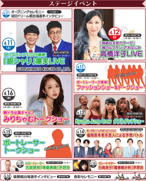 特設サイトでは、期間中にステージイベント、抽選会、キッズ向け催しなど多彩な来場イベントが案内されています。4月11日のオープニングセレモニーと初日ドリーム戦インタビューを皮切りに、銀シャリ、高橋洋子、みりちゃむ、長嶋万記、日高逸子らの出演企画が予定されています。