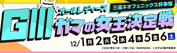 ボートレース蒲郡の師走第1弾は、6日間開催の女子戦「G3オールレディース三遠ネオフェニックス杯争奪ガマの女王決定戦」。10月末のヴィーナスシリーズに続き、人気のレディースバトルがナイターで繰り広げられます。