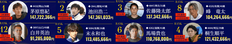 | 2 | 西山 貴浩 | 9 | 100,265,466円 |