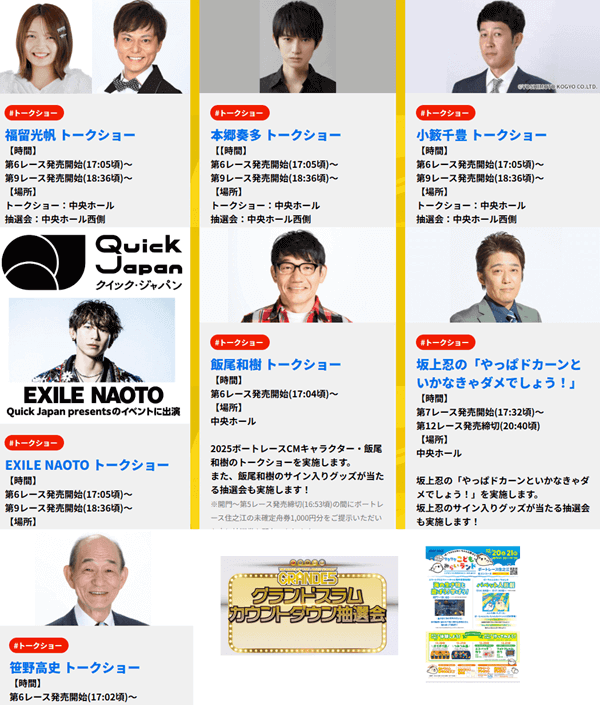 ・会期中は豪華ゲストのトークショーや抽選会、キッズ向けイベントも満載。ナイターレースならではの雰囲気と合わせて、現地観戦でもオンライン観戦でも存分に楽しめる6日間になりそうです。