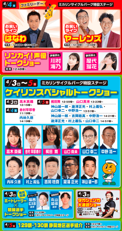 また、4月3日〜5日はケイリンスペシャルトークショーも実施され、神山雄一郎、滝澤正光、村上義弘、中野浩一ら豪華ゲストが登場します。