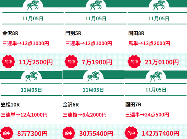 公式サイト上では、11月5日だけで複数の的中実績が報告されています。