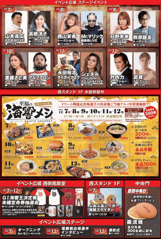 シリーズ期間中は、人気タレントやアーティストを招いたトークショー・ライブイベントが連日開催されます。ナイターレースと合わせて、ステージイベントやグルメ企画も楽しめる内容です。