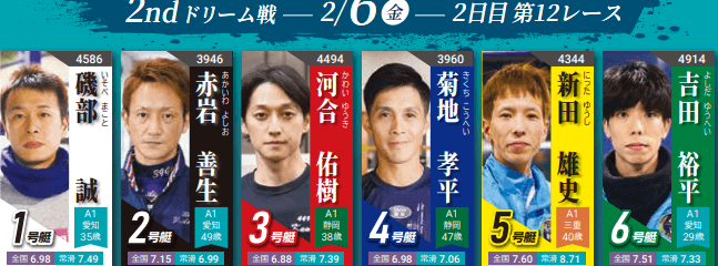 6 4914 吉田 裕平 愛知 SG優出経験の地力。足が整えば6枠でも舟券圏内へ。