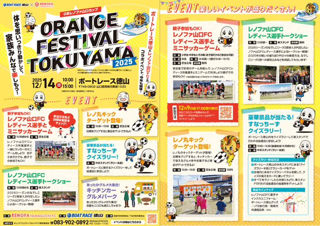 「オレンジフェスティバル徳山2025」開催。スポーツやグルメ企画に加え、レノファ山口FCレディース選手によるトークショーなど、サッカーファンも楽しめる1日です。