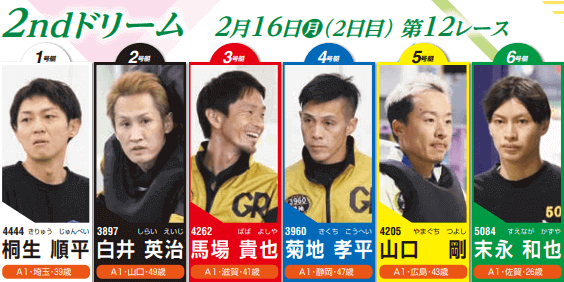 | 6 | 5084 | 末永 和也 | 佐賀 | 勢い十分の若手SG覇者。大外でも一発警戒。 |