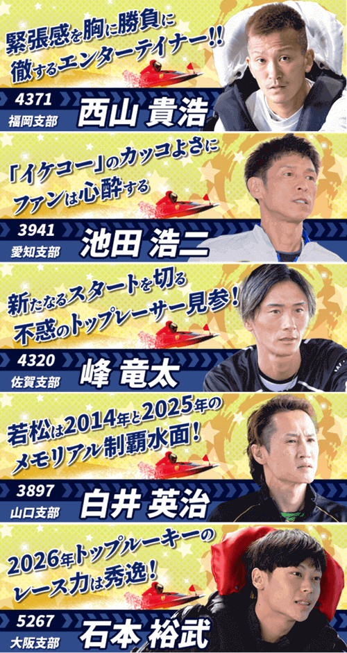 GP戦士12名、SG覇者23名が集うハイレベルな周年記念。舞台はナイター開催の若松。地元の声援と潮位変化が勝負を分ける水面で、総合力が試される。